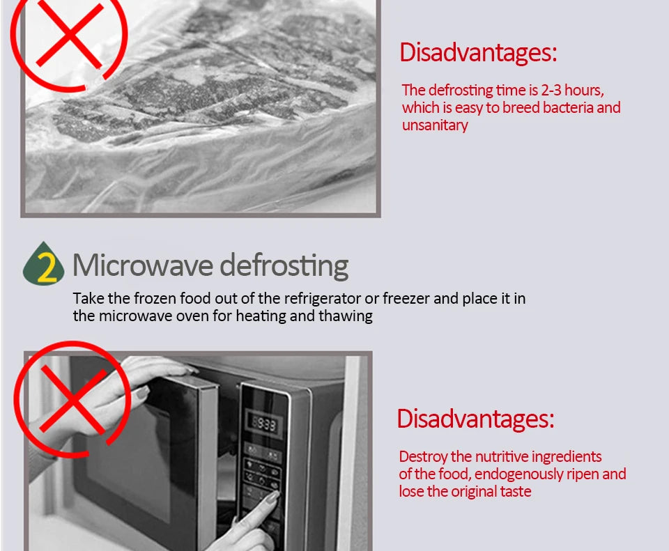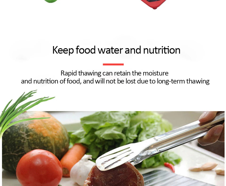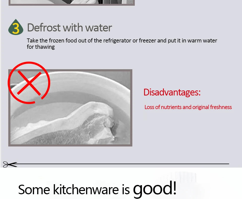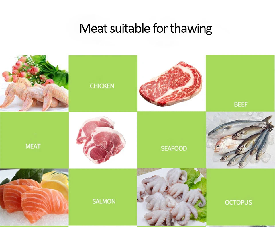 4. Absolument aucun produit chimique ni électricité n'est utilisé.Contrairement aux fours à micro-ondes qui cuisent partiellement les aliments pendant le processus de décongélation, le plateau décongèle la viande en toute sécurité et rapidement ;