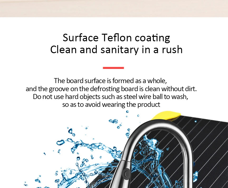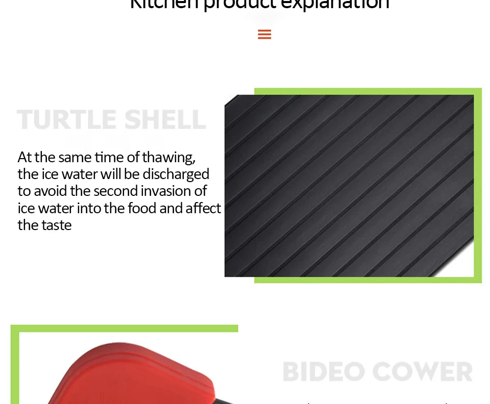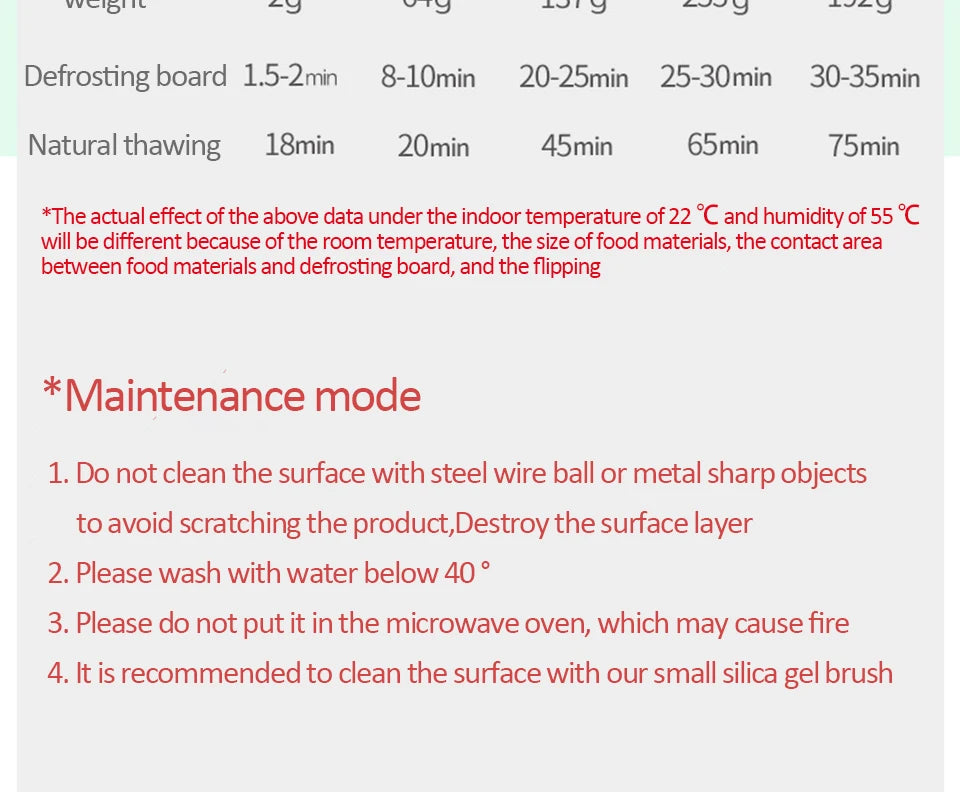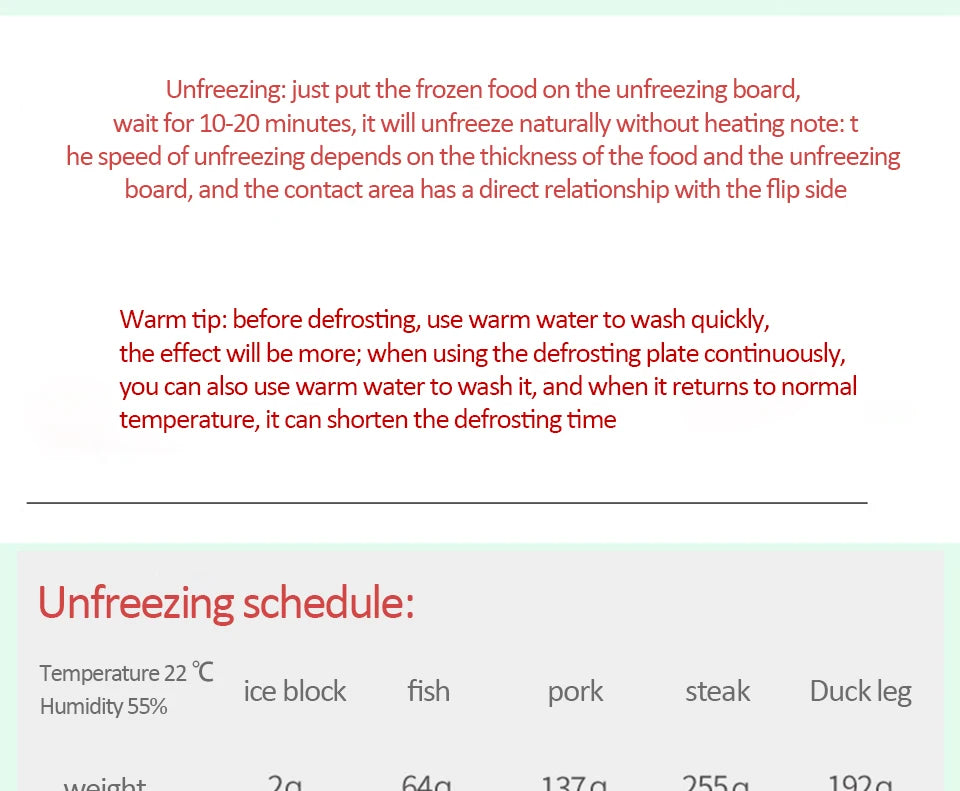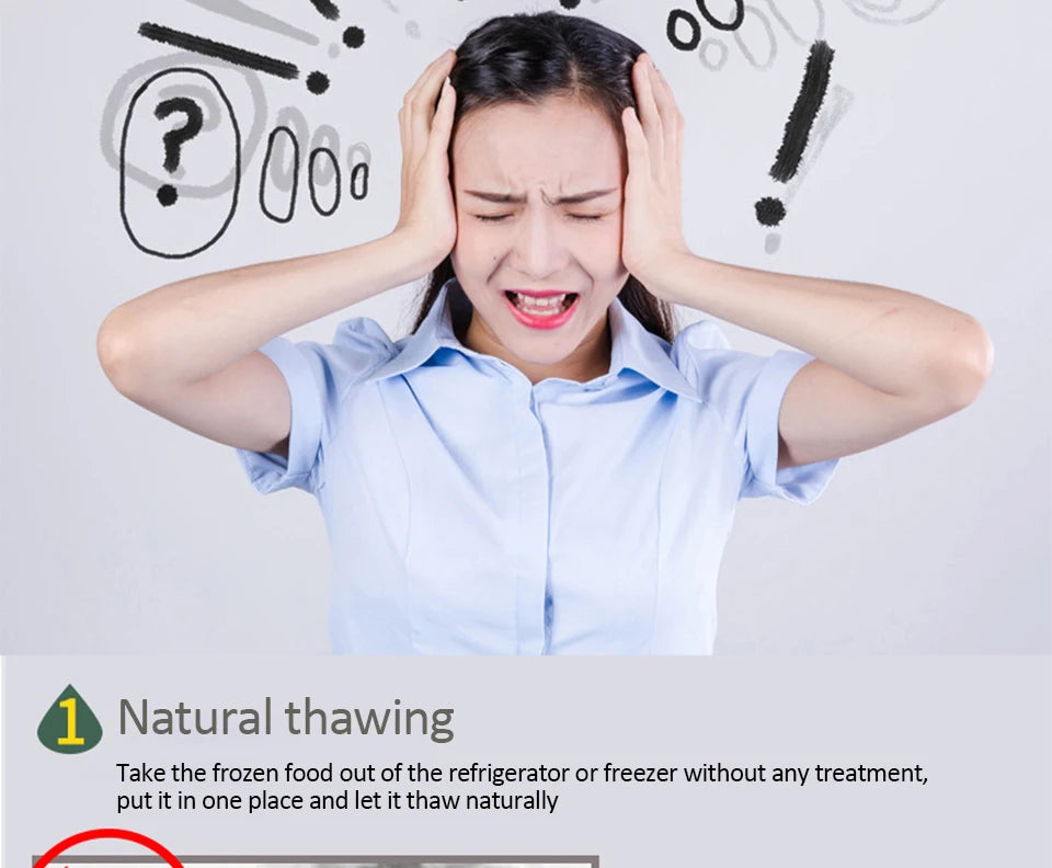 4. Absolument aucun produit chimique ni électricité n'est utilisé.Contrairement aux fours à micro-ondes qui cuisent partiellement les aliments pendant le processus de décongélation, le plateau décongèle la viande en toute sécurité et rapidement ;