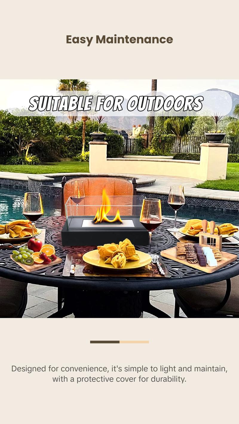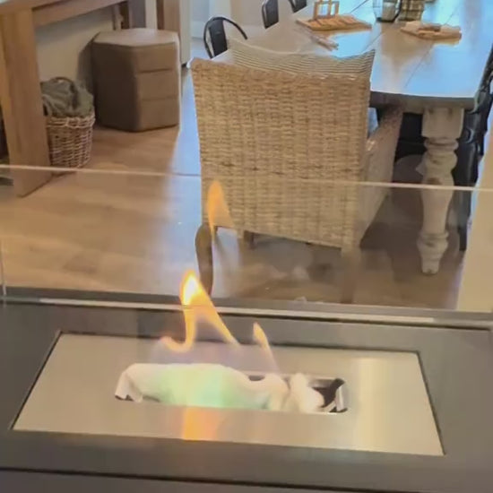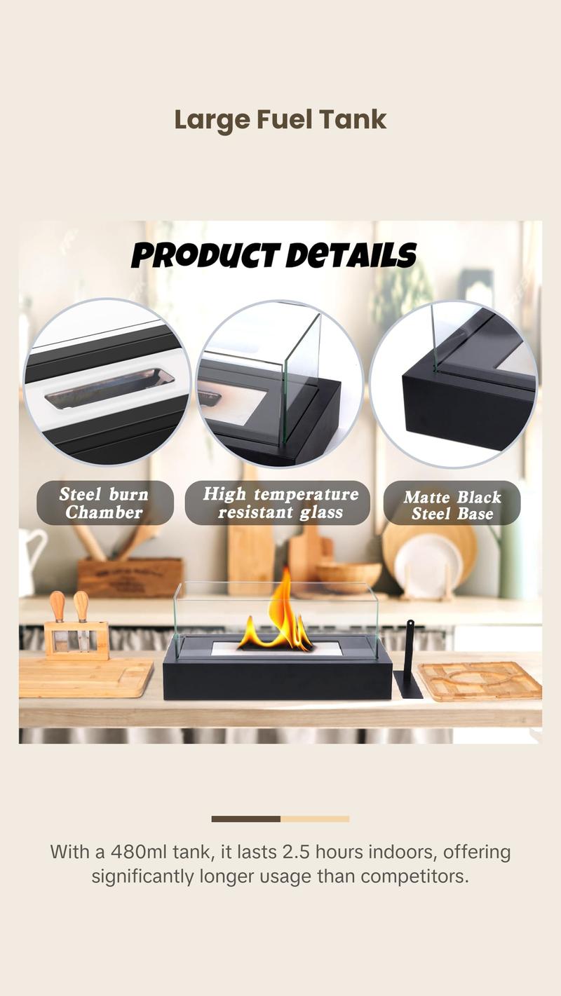 Le foyer est entouré d’un verre 360° résistant à la chaleur pour une sécurité maximale et une flamme stable, sans fumée ni odeur.
